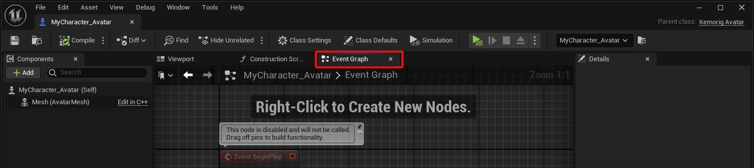 Unreal might open your Avatar Blueprint as a data only Blueprint with a notice at the top saying so. If it does, click Open Full Blueprint Editor.