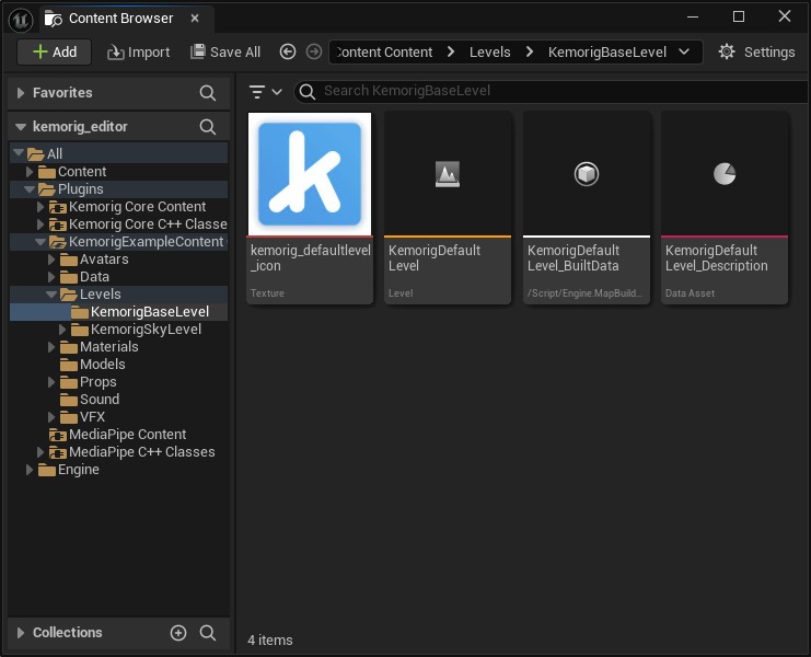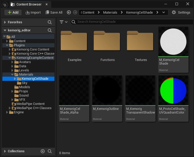 Example content is located in the Content Browser in Plugins/KemorigExampleContent Content/.
