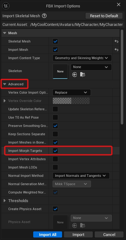 To import your model with morph targets, make sure Import Morph Targets is enabled.