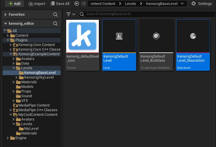 - A Blueprint of type KemorigLevelBlueprint to contain blueprint logic in your Level