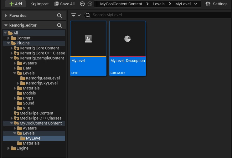 In the content browser, navigate to one of the folders in KemorigExampleContent Content/Levels/ and find its Level and DataAsset. Copy/Paste a copy of them into our folder and rename them.