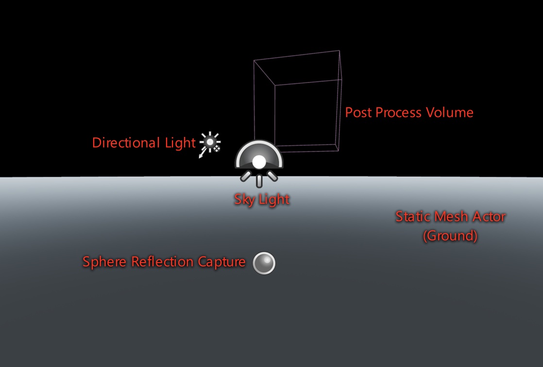 - Sky Light - creates ambient light (i.e. non-directional light, ensures surfaces not in direct sunlight are not pitch-black). This actor can do this using the actual sky of the level, or a cubemap. In this case, it uses a cubemap.